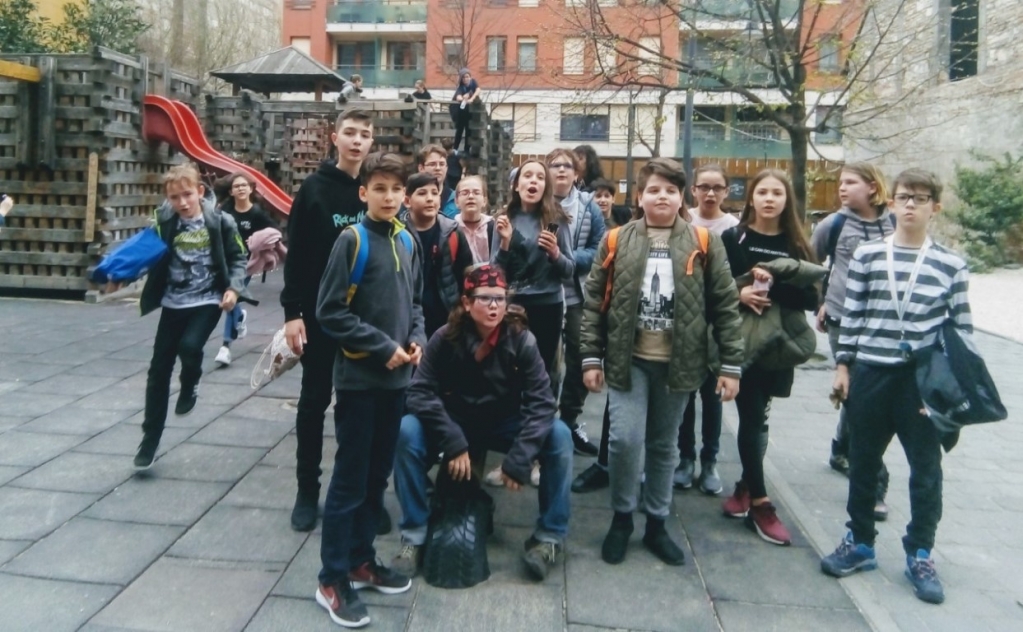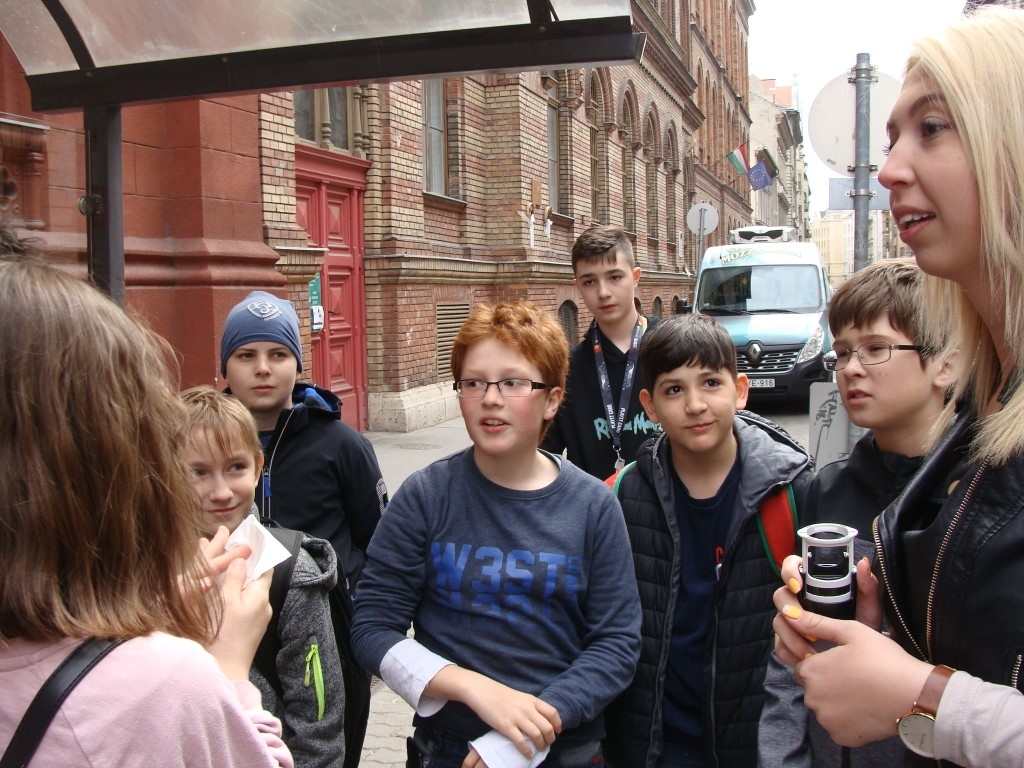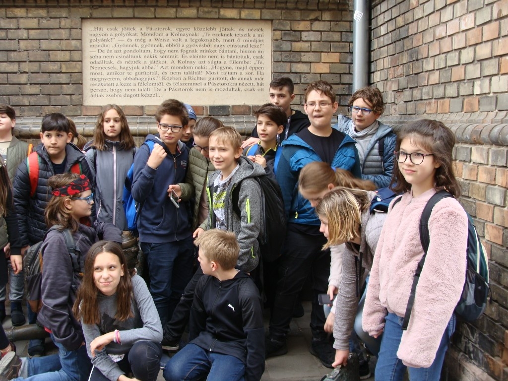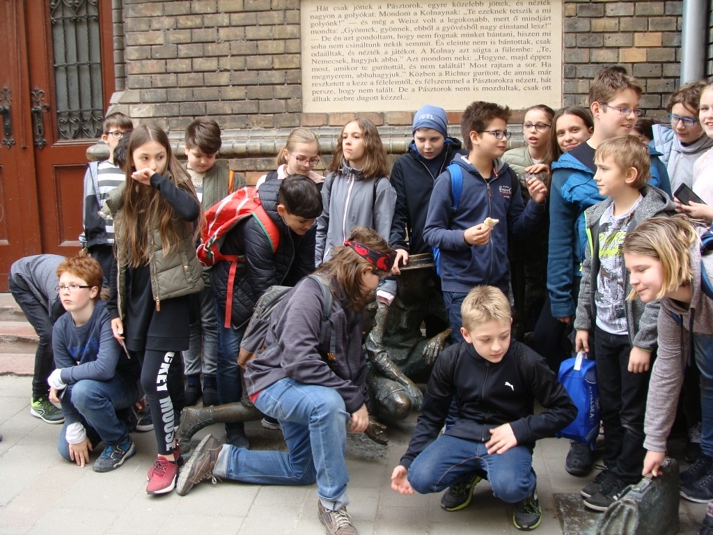 Megérkeztünk első helyszínünkre, a Nemzeti Múzeumhoz. A program vezetője, egy fiatal lány nagy örömmel fogadott bennünket. Elmondta, mennyi érdekes dolog vár ránk, s rögtön kérdéseket tett fel nekünk a regényről. A helyesen válaszolók egy körpecséttel gazdagodtak, amivel a Gittegylet tagjává váltak. A kellemes időben hosszú sétát tettünk: Lónyai utcai iskola, Köztelek utca, Kinizsi utca. Megtudtuk, hol tanultak a Pál utcai gyerekek és az író, hol lakott Boka, hol szívták fel a dohányport, és hol prüszköltek sokáig. Sok kérdés, sok gondolat elhangzott, de még idéztünk is a műből. A Práter utcai iskola előtt található golyózó fiúk szobrát lelkesedéssel figyeltük. A grundon nagyon jól éreztük magunkat. Élmény volt, soha nem fogom elfelejteni, hogy itt lehettem. Hirtelen azt hittem, hogy én is a Pál utcai fiúkhoz tartozom. Aztán utolsó helyszínünkre, a Füvészkertbe érkeztünk. Bementünk a Pálmaházba, és a növénysimogatóban is voltunk.